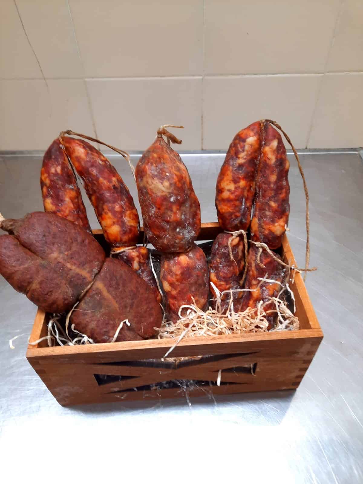 1 Soppressata Artigianale 400/500g: Oltre alla carne gli altri unici ingredienti utilizzati sono sale, pepe, salsa di peperoni biologici e peperoncino calabrese in quella piccante; viene poi insaccata e legata a mano con spago naturale. Stagionatura di circa 3/4 mesi;